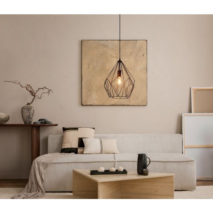 The CARLTON pendant light features a black diamond-shaped caged body. The caged lampshade creates a fascinating play of light and shadow as soon as the light is on. The pendant light complements modern vintage-style interiors and works well in any space, whether in the kitchen, the living room or above the table in the dining room. The product requires 1 x E27 lightbulb, which is not included.