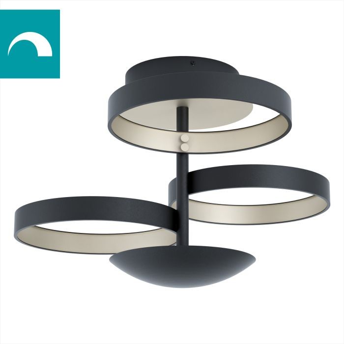 The GROMOLA LED ceiling light features a sleek black and champagne-colored metal design with three decorative rings and an LED cover shaped like a shallow bowl, creating elegant indirect lighting. Integrated LEDs emit warm white light, blending seamlessly into modern interiors.