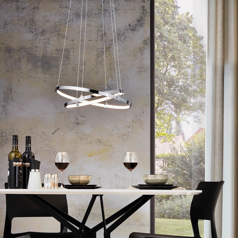 The NEBREDA pendant light (Material number 96639) offers modern illumination for indoor spaces. With a sleek design featuring a chrome steel enclosure and a white plastic shade, it seamlessly blends style with functionality. Emitting warm white light at 700-880 lumens and 3000K, it provides a cozy atmosphere. This pendant light, with dimensions of 1200mm (H) x 450mm (D), is suitable for various interior settings.