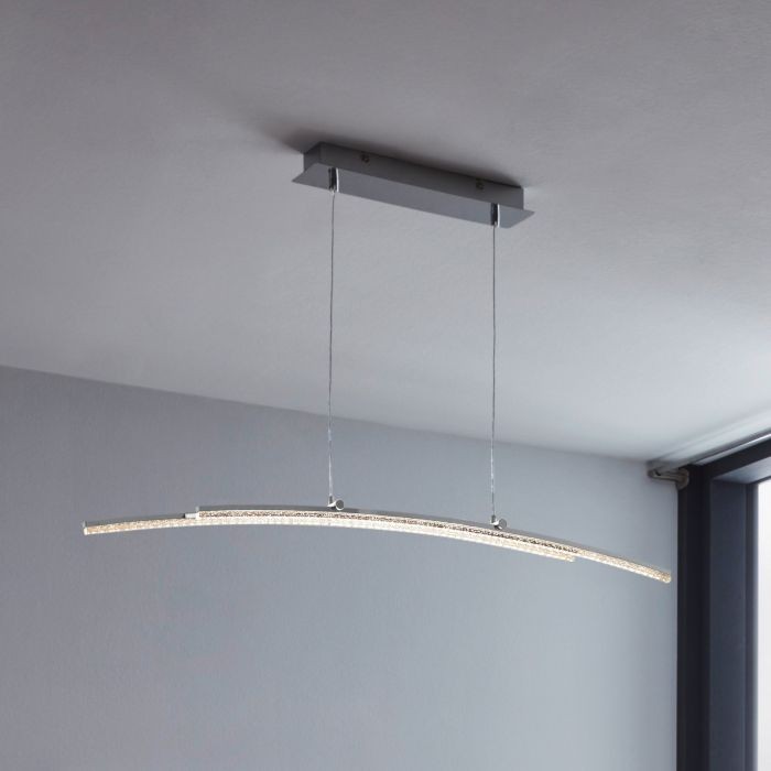 Eglo Lighting Pertini LED ceiling pendant features a rectangular ceiling plate in polished chrome finish, with 2 curved bars and transparency light diffusers.