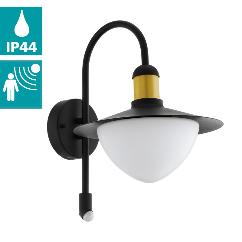 Eglo's 97286 SIRMIONE outdoor wall light offers style and functionality. Crafted with durable zinc-plated steel in black and gold, it exudes elegance. The matte-opal glass shade softly diffuses light, creating a welcoming ambiance. Equipped with a sensor switch, it provides convenient motion-activated illumination within an 8-meter range.