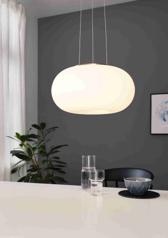 This is an Eglo product, item code 86814. The Optica 2 light modern ceiling light Pendant (medium) is a simple yet effective design with a doughnut shaped opal glass shade and nickle matt finish.