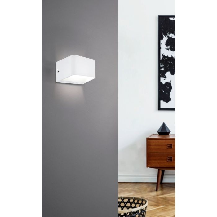 The SANIA 4 wall light (Material number 98421) is an indoor fixture with an aluminium enclosure in white. With dimensions measuring 80mm in height, 130mm in length, and an overhang of 90mm, it offers subtle illumination to indoor spaces. The fixture does not include a switch and operates at a mains voltage of 220-240V, 50/60Hz, with a maximum wattage of 6W. It utilizes LED technology, providing warm white light with a color temperature of 3000K and a luminous flux of 670 lumens.